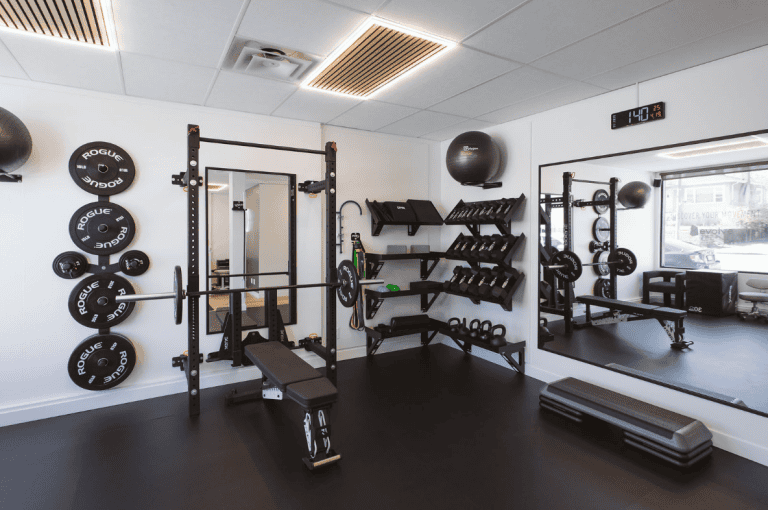 Our clinic lighting was specifically designed to be dimmable and colour adjusting. You’ll notice the lights shine horizontally as to avoid shining too brightly downward. When our patients are exercising in the gym, the horizontal lights limit eye strain and irritation when looking up at the ceiling.